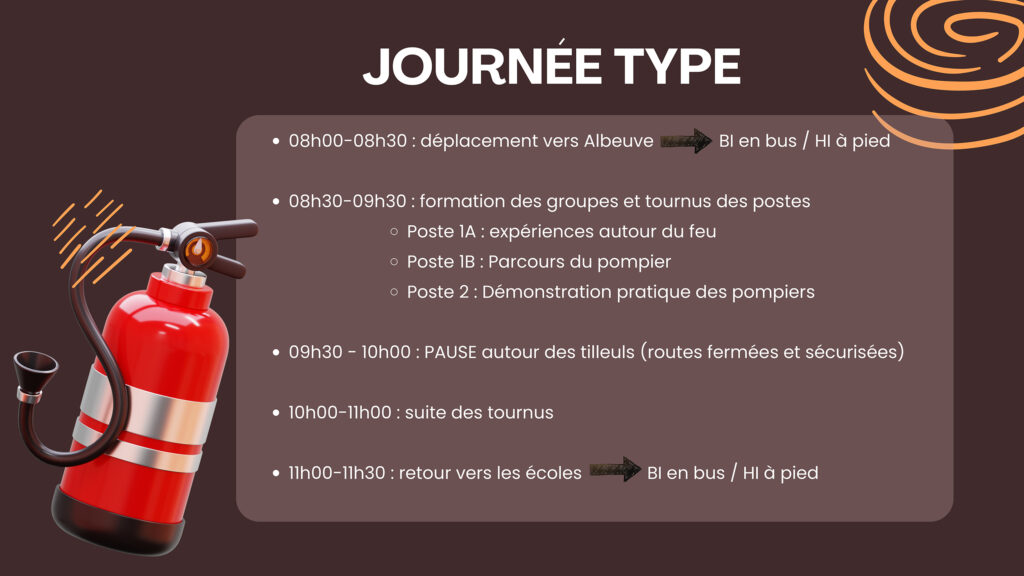 La matinée sur place se déroule sous forme d’ateliers en tournus : expériences autour du feu, parcours inspiré des exercices de pompiers et démonstration pratique réalisée par les sapeurs-pompiers. Les élèves observent, manipulent et découvrent les équipements et les gestes essentiels d’intervention.