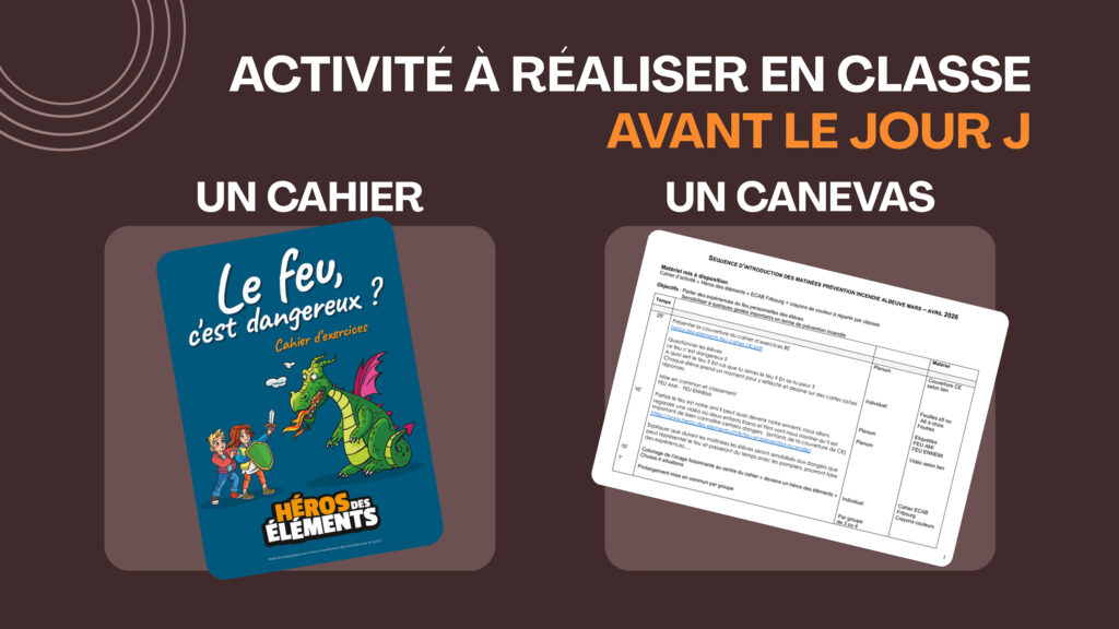 à ses dangers permet d’introduire la thématique, tandis qu’un canevas pédagogique aide les enseignantes et enseignants à aborder les mécanismes du feu et les gestes de prévention.